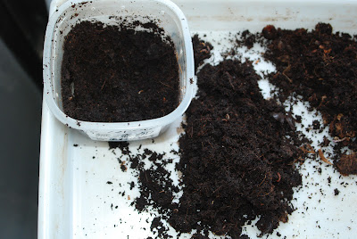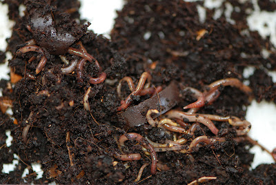 | 表面を外してみるとチラホラみみずが見えてきた。 赤ちゃんだったみみずはかなり成長している。堆肥らしきものも出来てきている。 |
