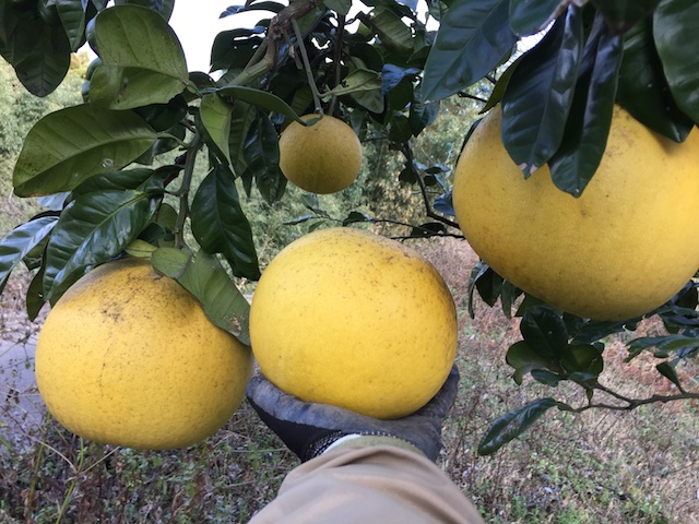 で、昨日収穫した八朔の中に、なぜ晩白柚が1個混じっていたかというと、昨日八朔を千切っていたら、側の晩白柚の木の下に1個が転がっていたのだ。