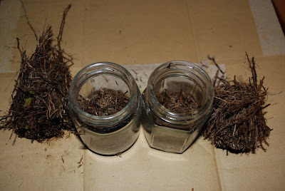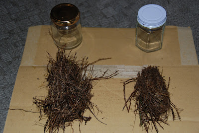 | どちらの髭も土はきれいに落としている、右の冷凍解凍したものはvolumeが小さく見えるが冷凍したときの条件によるものでもともとの量はほぼ同量である。瓶の容量は全く同じものがなかったのでごくわずかに右の方が小さいのは大めに見て頂きたい。 |