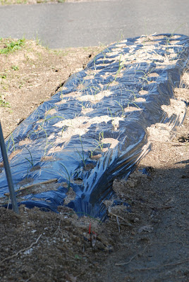 | これが植えて2週程経った最初に植え付けた苗(12/12)。 ショウガの植え付けに伴い、右端の1列は4月に収穫した。 |