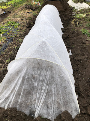 不織布をトンネル方式とべた掛け方式の両方でやったのだが、仕事が終わる前にしっかりした雨が降り出し、べた掛け方式の種芋の植え付けは後日やることにした。