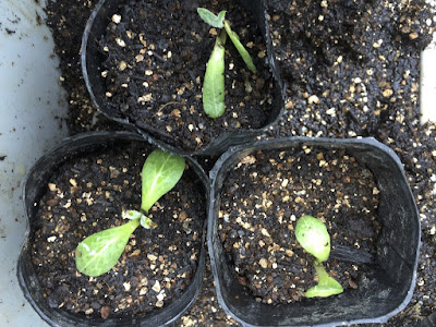 | 今年はこんな感じで、多くの種を発芽させた。 チェックが遅れると、葉が出てきたり、水が無くなり乾燥で苗をダメにした。 左は白ズッキーニ、通常はこんな葉が出てくるまでは放っておかない。 |