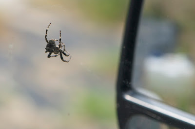 | こちらは、車の窓の外にぶら下がっていた蜘蛛。 この時期ジョロウグモがまだ小さいのだが、これはオニグモのようだ。 以前、私の車の中にもこんな蜘蛛がいたことがあり、娘たちに嫌われた記憶がある。 |