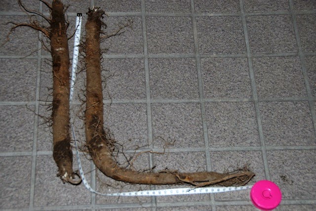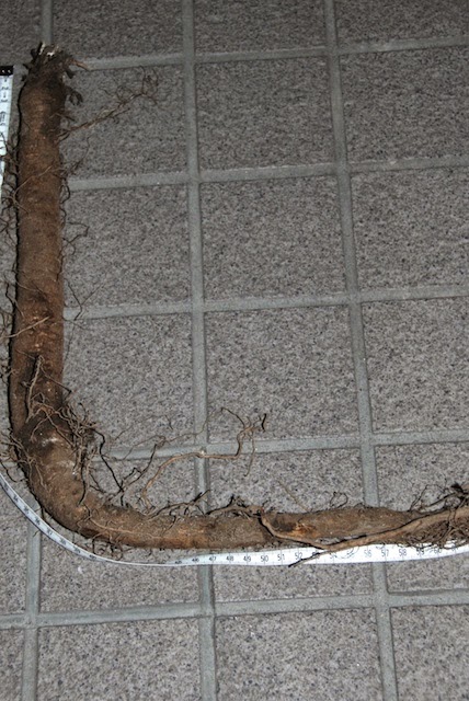 | 分かりにくい写真だがよく見ると6cm程根が飛び出している。 食べる側から見ると、このような先端飛び出しゴボウよりL字型ゴボウの方が嬉しい。 |