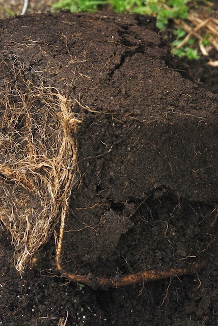 | これがダストボックスをひっくり返して取り出した土。 左側の底の部分には先端が曲がったゴボウや多くのひげ根が見える。 |