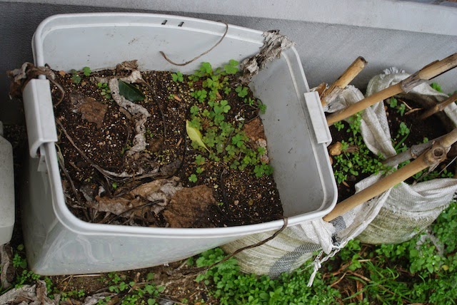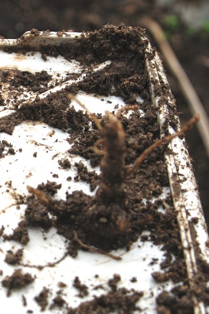 | これがダストボックスをひっくり返して取り出した土。 左側の底の部分には先端が曲がったゴボウや多くのひげ根が見える。 |