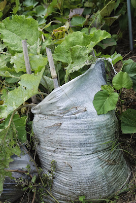 そしてこちらは、土嚢袋に植えた短いゴボウ。