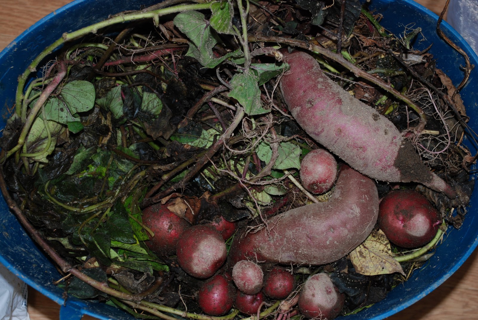 | 今日の収穫。サツマイモの葉っぱの上に見えているのはサツマイモ、ジャガイモ(アンデス赤)の一部。下の方にはツクネ芋、キクイモ、最後に残ったゴーヤがある。人間様が食べれる分を外してあとはみみず君の餌になる。芋類の葉っぱは良い餌になるので萎えたところから収穫してきた。これくらい収穫してくると餌として一度に与えきれないが、どんな餌も余った場合は冷凍して保存するようにしている。解凍したあとは柔らかくなるのでみみず君もより食べやすいようだ。