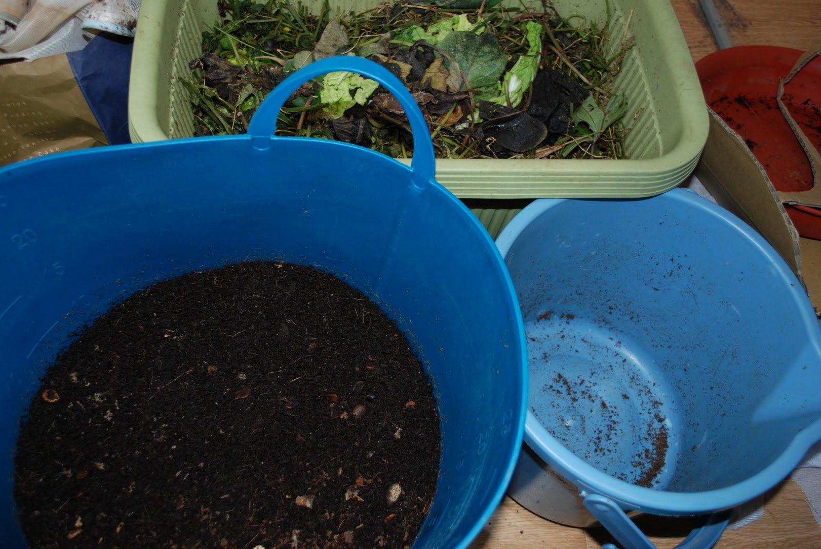 | 今日は室コン2号チェック、みみず君たちは今回も1ヶ月足らずで前回与えた餌を完全に平らげていた。堆肥の状態も上等。みみず君も元気。今回の餌は冷凍柿、冷凍落ち梅。冷凍つくね芋、サツマイモ、それと今日収穫した最後のゴーヤと大量のサツマイモの葉と茎。 |