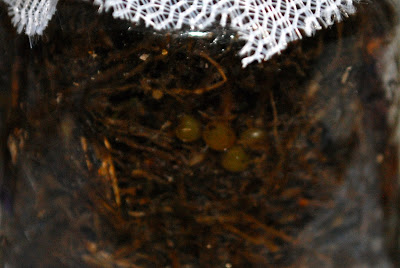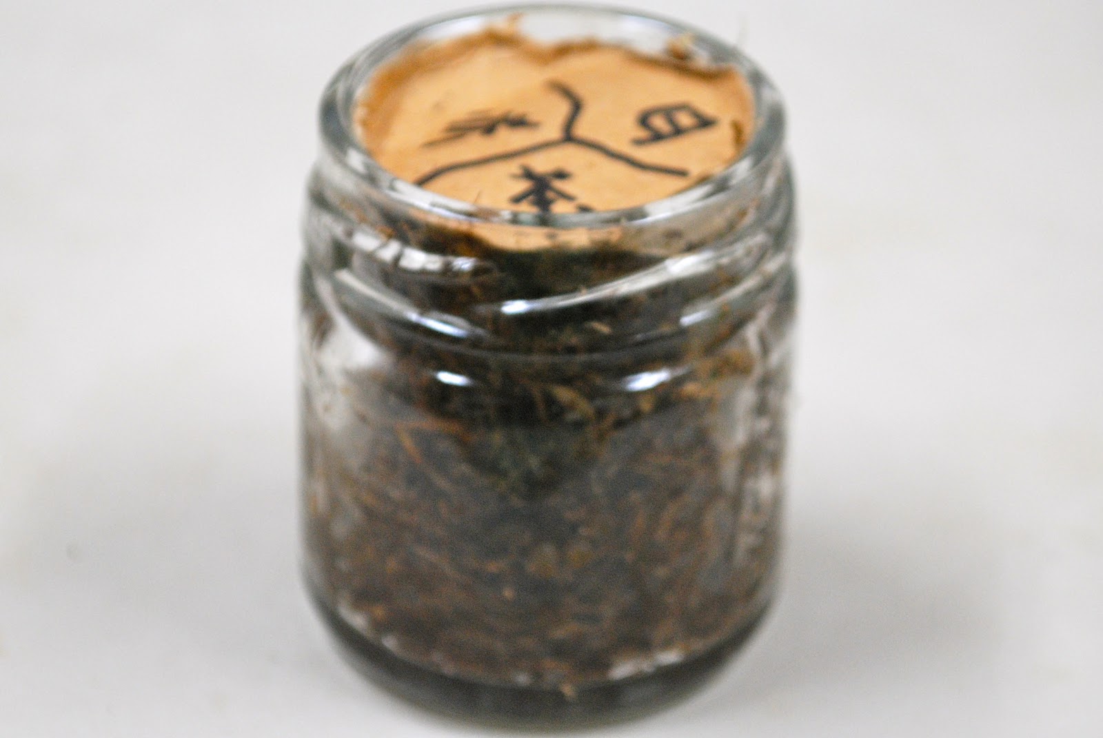 | 直径3cm程の小さな瓶を段ボールで3区画の分けた。ベッドとしてはツクネの髭(冷凍&解凍後)をぎっしり詰め、それぞれの区画に色の違う3種類の卵を5個づつ入れた。卵とツクネの髭以外には何も入ってないはずだ。この瓶を観察小屋9号とする。 |
