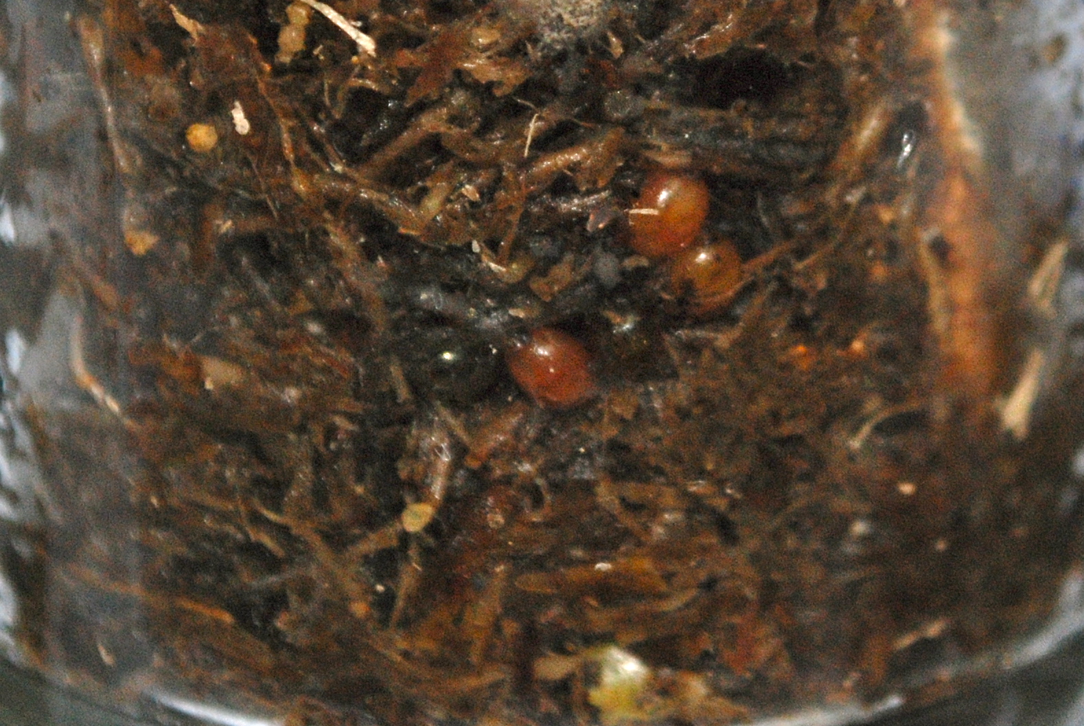 | ここが赤っぽい卵を入れた区画。何と設定して8時間後に1匹孵化していた。生まれたては真っ白くしているはずだが、もうピンク色になっている。生まれて数時間で赤みがでてくることがわかった。(堆肥移動時に見つけた、同じような色の卵からまさに孵化していた赤ちゃんは真っ白だった) |