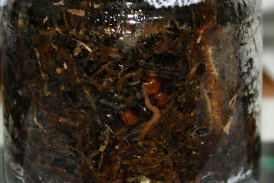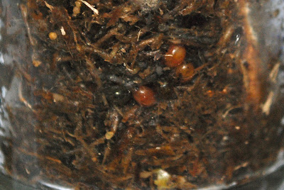 以前、卵の孵化実験(1/1報告)は300個程卵を集めての実験だった。結果、孵化率は27%だったが、卵の数が多すぎて、不正確なデータになっていた。最近、堆肥をバケツから堆肥袋に移しているとき、丁度卵の孵化の瞬間を見ることが出来た。真っ白な赤ちゃんが卵から半分顔を出したり引っ込んだりしていた。卵は通常黄色っぽいが、その卵はどちらかというと赤みがかっていた。堆肥の中の卵をよく観察すると、孵化したものと同じような赤みがかった卵と、産み落とされて間もない感じの黄色というより少し白みのある卵と、孵化後の透き通った抜け殻と同じような色で、透き通ってはない焦げ茶色の卵がある。今回はこれら3種類の卵を僅か5個ずつ、区分けした小さな部屋の入れてみた。特に目的はなく観察のためにのみ入れたのだが、入れて8時間後チェックをしてみたら、赤みがかった卵が一個孵化していた!しかも赤ちゃんの色はもう赤みがかっていた。赤みがかった卵はやはり孵化寸前の卵なのだ!とすると焦げ茶色の卵は死んだ卵なのであろうか?時々チェックしてみることにしよう。