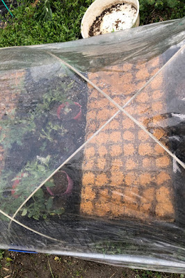 失敗した昨年よりさらに早い種まきなので、この紙ポットはペットボトルを利用した水封マルチもどきのビニールトンネルの中で芽出しさせることにした。