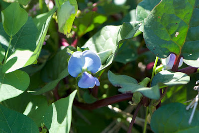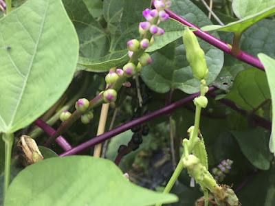 そして、2〜3週間ほど前、四角豆が花をつけ始めた頃は、すでにツルムラサキの蔓葉の激しい攻めにあっているようだった。