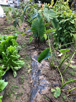 | 3種類の里芋の大きな親芋を逆さ植えした畝だ。 どの株も、かなり大きく成長している。 |