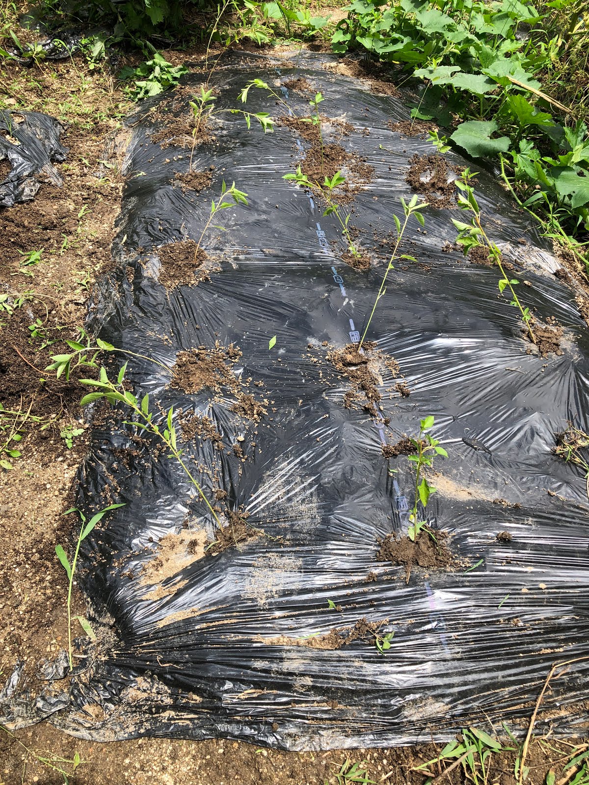 そこで、今日は雑草予防にマルチを引いていた場所に、ヒョロ苗を植えていった。