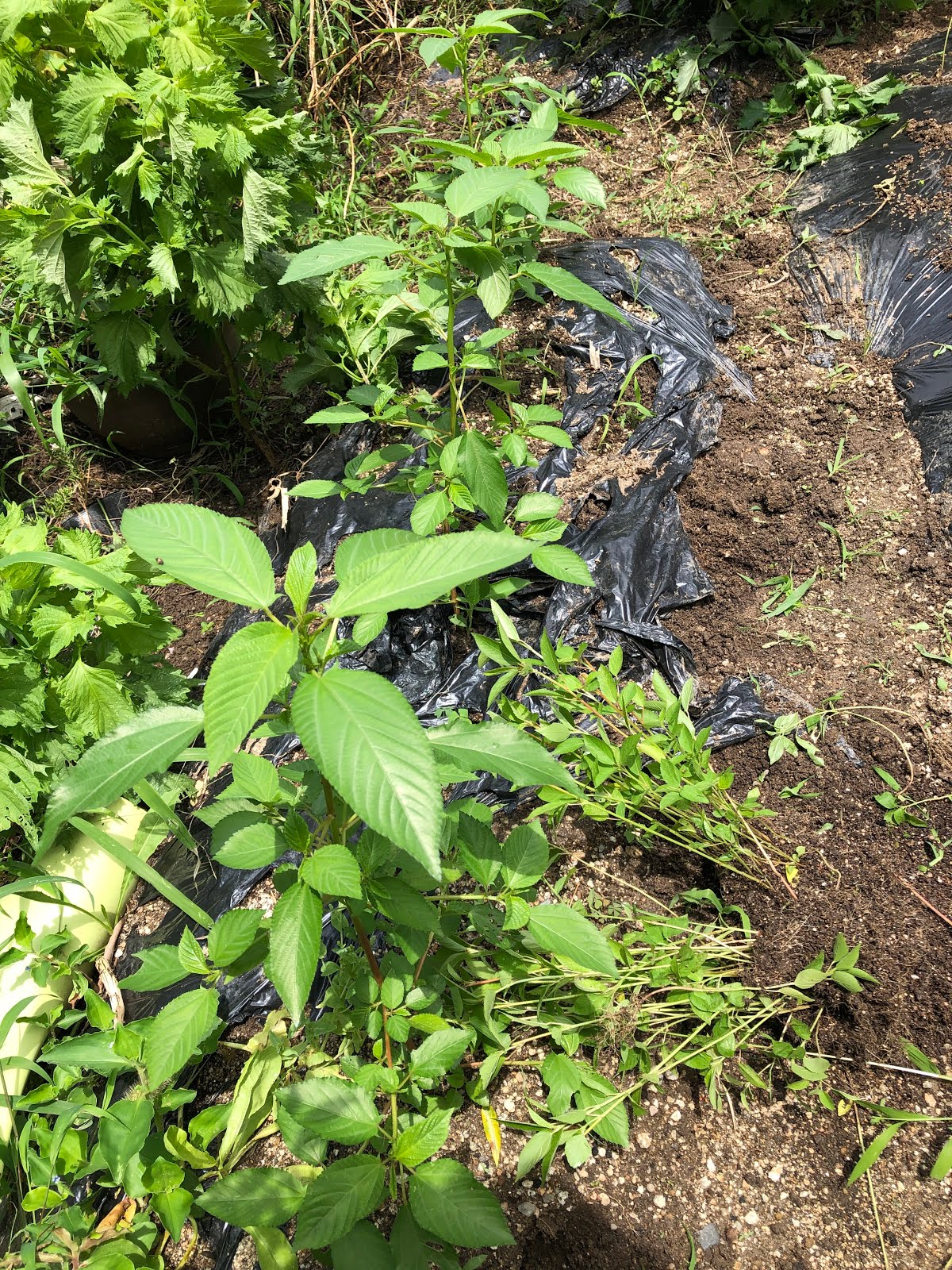 | こちらは先日植え付けた第2陣植え付けのモロヘイヤ。 高さは30㎝くらいになって、これらの苗からも少しづつ収穫が始まった。 |