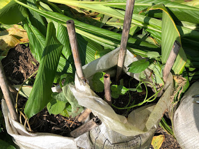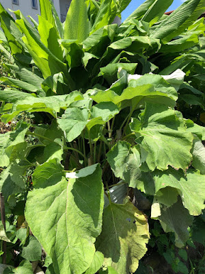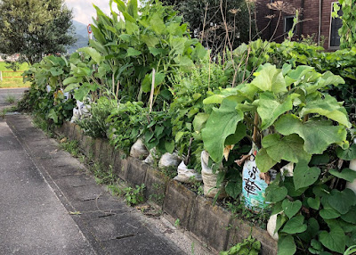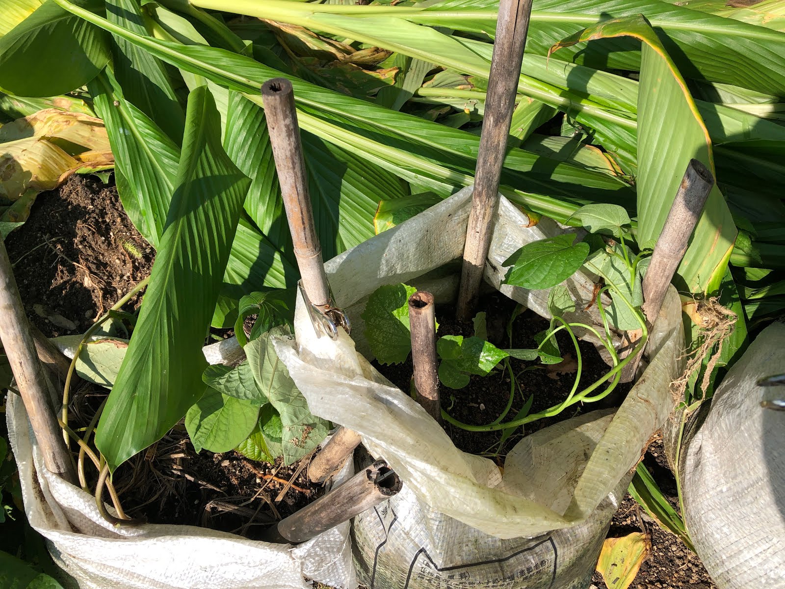 先日はビニール栽培のゴボウの後方にあったヤーコンを切り倒したが、別のビニール袋のゴボウの苗(上の写真)はウコンの苗に圧迫されかけていた。