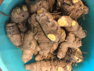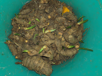 で、今日はゴボウの苗の近くにあるウコンを根茎ごと掘り起こした。