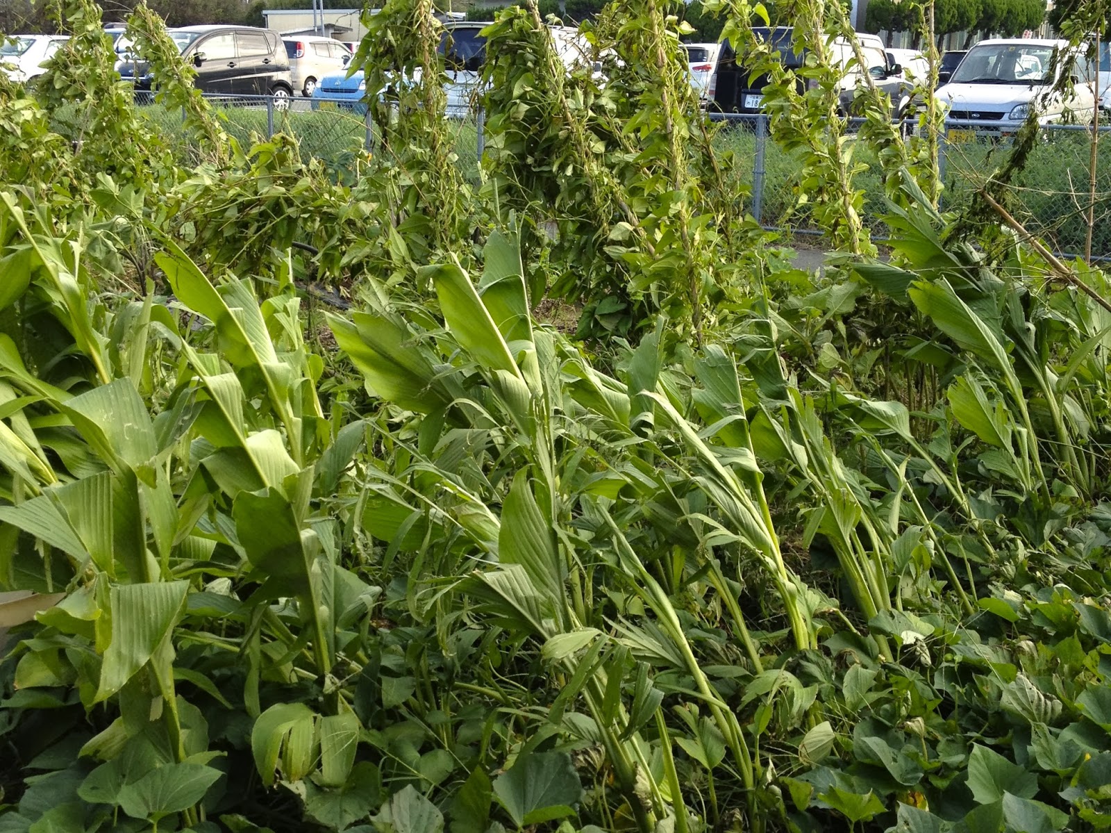 | 昨年9月台風15号が接近したときの様子。ウコンもツクネ芋も倒れてその後弱った。 |