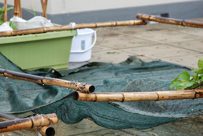 さて、こんな大風の中でも今年カボチャの立体栽培のために作った3段構えの竹組は、ビクともしていなかった。