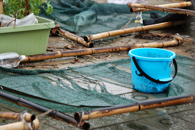 波打つネットがバケツで押さえられ裂けたのだろう。