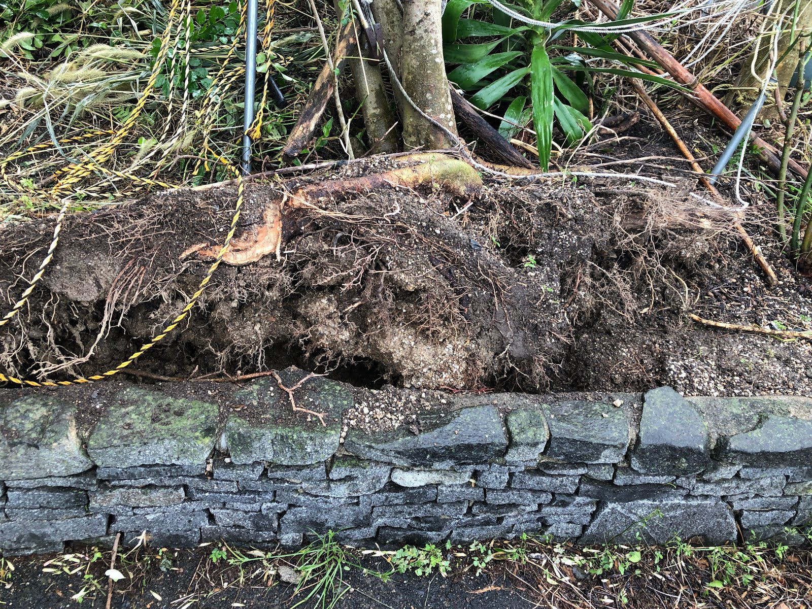 | 根をむき出しに倒れたわけではないが、2本とも大きく傾いている。 この2本も後日時間があるときに、剪定と幹の再固定をおこなおう |