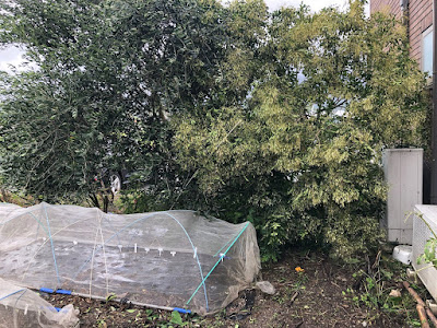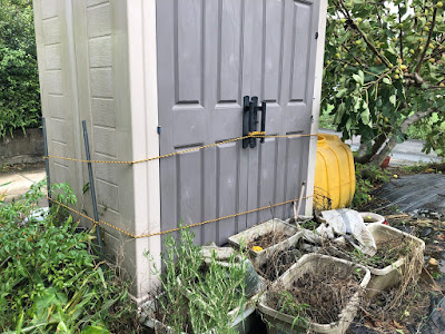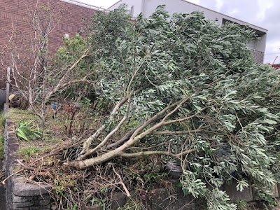 9号の時の被害は我が家では手前のオリーブの木1本だけだったのだが、今回は第1菜園の南側にシンボルツリーとして植えていたシマトネリコと2本のオリーブの木は全て倒れてこんな感じ。