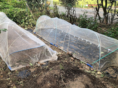 我が家の菜園の中で一番気にしていたツクネ芋や宇宙芋の苗には周りに支柱用鉄パイプを打ち、ロープやテープで固定しておいた。