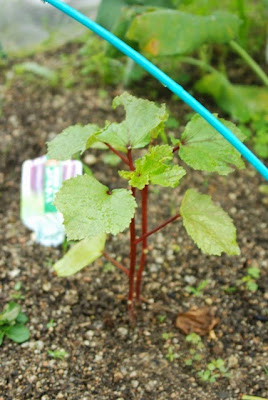| よく見ると葉の付け根に紫色をした部分が若干ある。 紫色の沖縄オクラは、この気質が前面に出てきたのだろうか? |