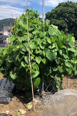 こちらはかなり頭でっかちになって、強風に弱くなっている可能性が高いツクネ芋の畝。