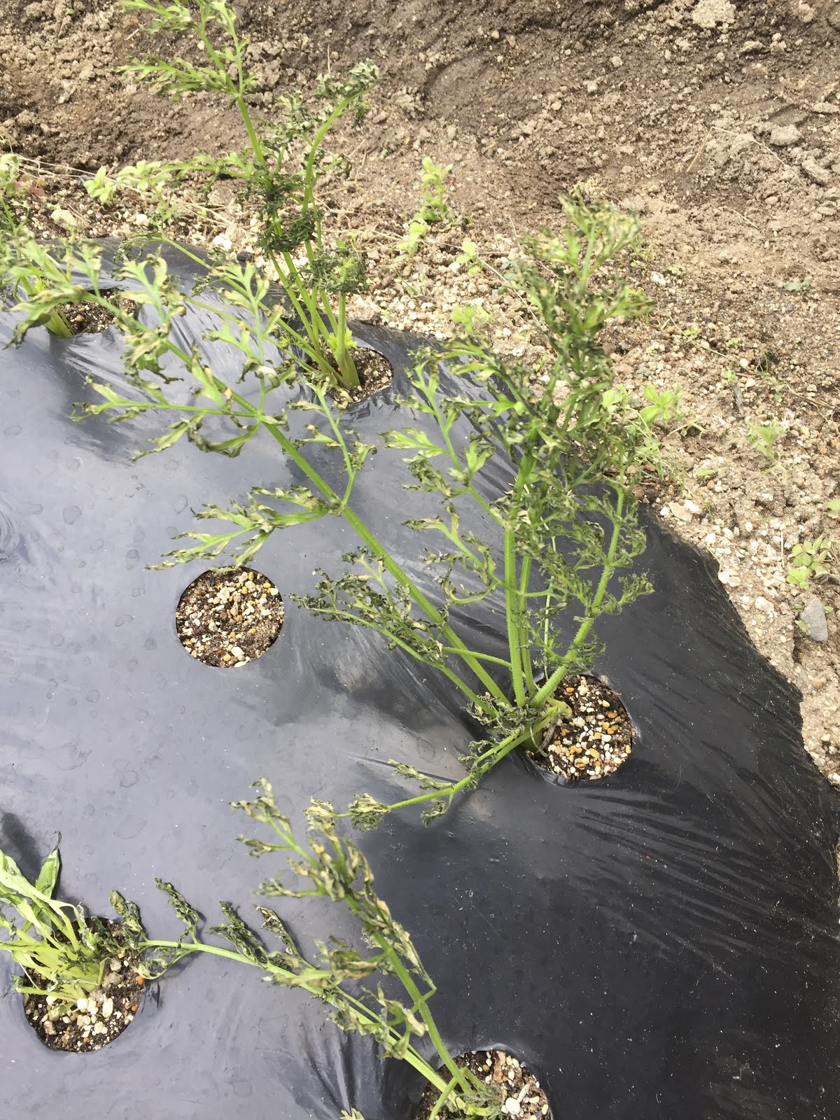 | やっと、苗が20cm近くまで育っていた人参。 風被害の時は、水分が蒸散するのだろうか?葉が乾いてチリジリだ。 こちらもじっと待つしかないだろう。 |