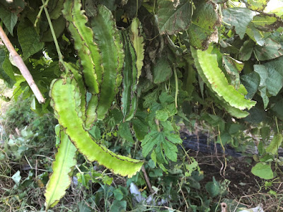 | これまで手が届かなかった高い場所の四角豆は収穫時期を過ぎてしまっている。 これらは種採り用にこのまま残すことになる。 今日はこの辺りに出来ていた若い豆も収穫して帰った。 |