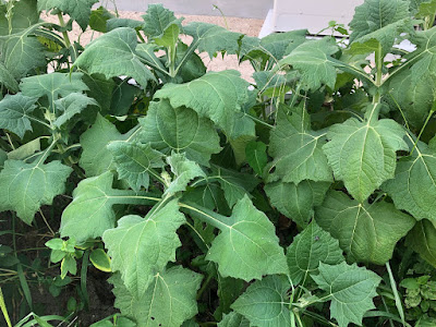 一方、こちらはこれまでとても元気と思っていたが、最近の酷暑と雨不足で若干弱り気味のヤーコンのメインの畝。