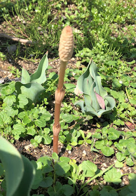 | 花壇に生えるツクシやスギナはもちろん雑草だ。 ゆっくり、果樹園などでツクシ採りをしたいのだが、なぜか余裕がない。 |