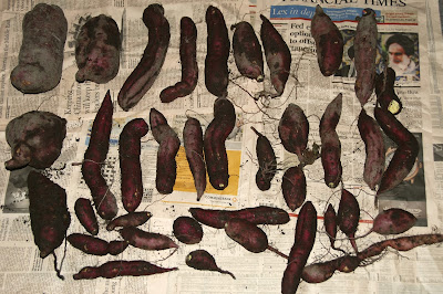 | わずか6時間程の時間の経過で、表面のきれいだった紅色は色あせてしまった。 それにしても土嚢袋の中で色々な形のサツマイモが出来るものだ。 畝に出来る芋と比べて、細くて長い芋が多いのは一つの特徴だろうか? |