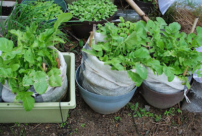 | ダイコンの種を植えた土嚢袋の3袋、今回種を撒いたものと3週間の時間差だ。 どの袋のダイコンも順調に大きくなっているようだ。 左の一袋が腰水法をおこなっている。 今の所、どの袋も育ちに差はないように見える。 |
