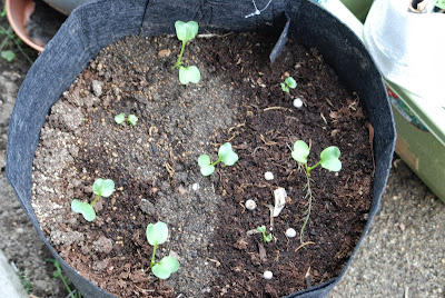 | 育ちの遅い芽3本は引き抜いて、そこに又種を撒いておいた。 この容器で8本のダイコンを育てるつもりだ。 |