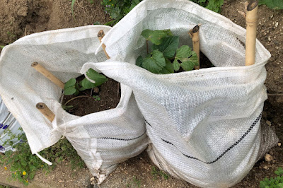 | こんな土嚢袋にも、他の伸びた苗を挿し穂をする。 |