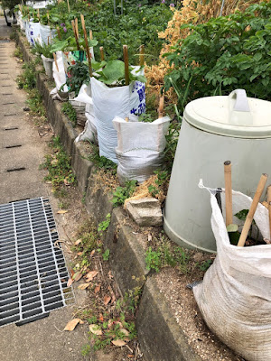 | 第1菜園の端には、サツマイモの土嚢袋と、ゴボウのビニール袋が並んでいる。 |