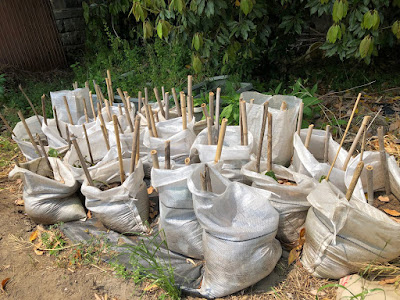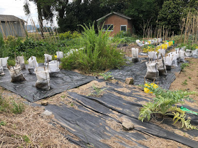 それに対し、メインになる第2菜園の方は、木の陰になるところにまとめて土嚢袋を置き、そこに挿し穂した。
