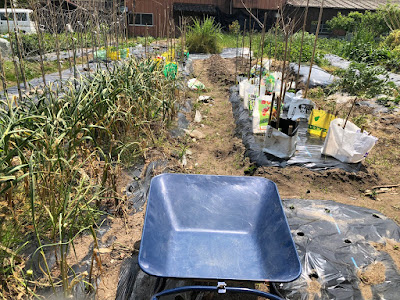 で、これら日陰に置いていた土嚢袋は、枯れた苗が入った袋も含め、一輪車で正規の場所に移動させた。