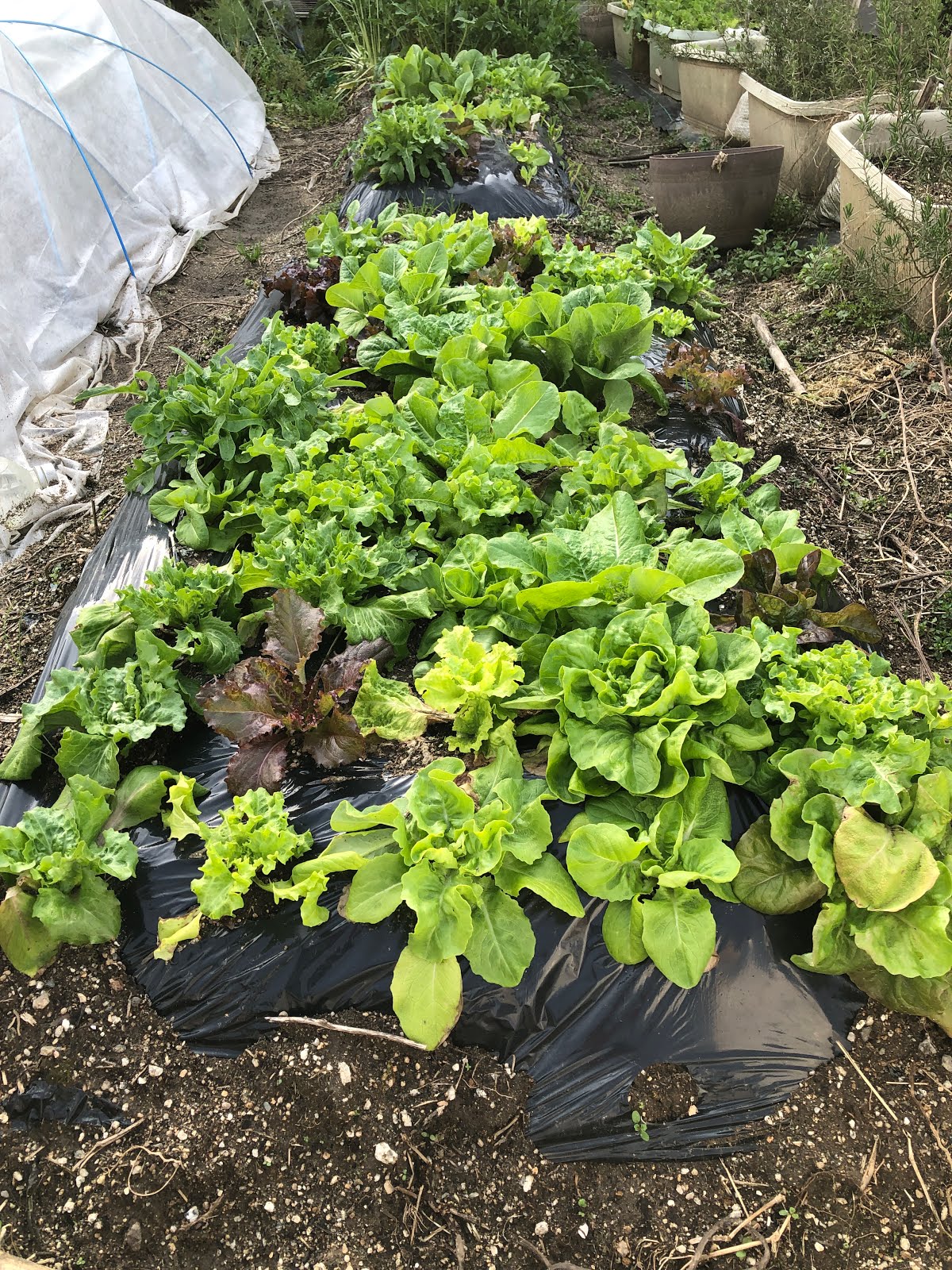 ビニールトンネルの中のレタスはとても柔らかそう。 |