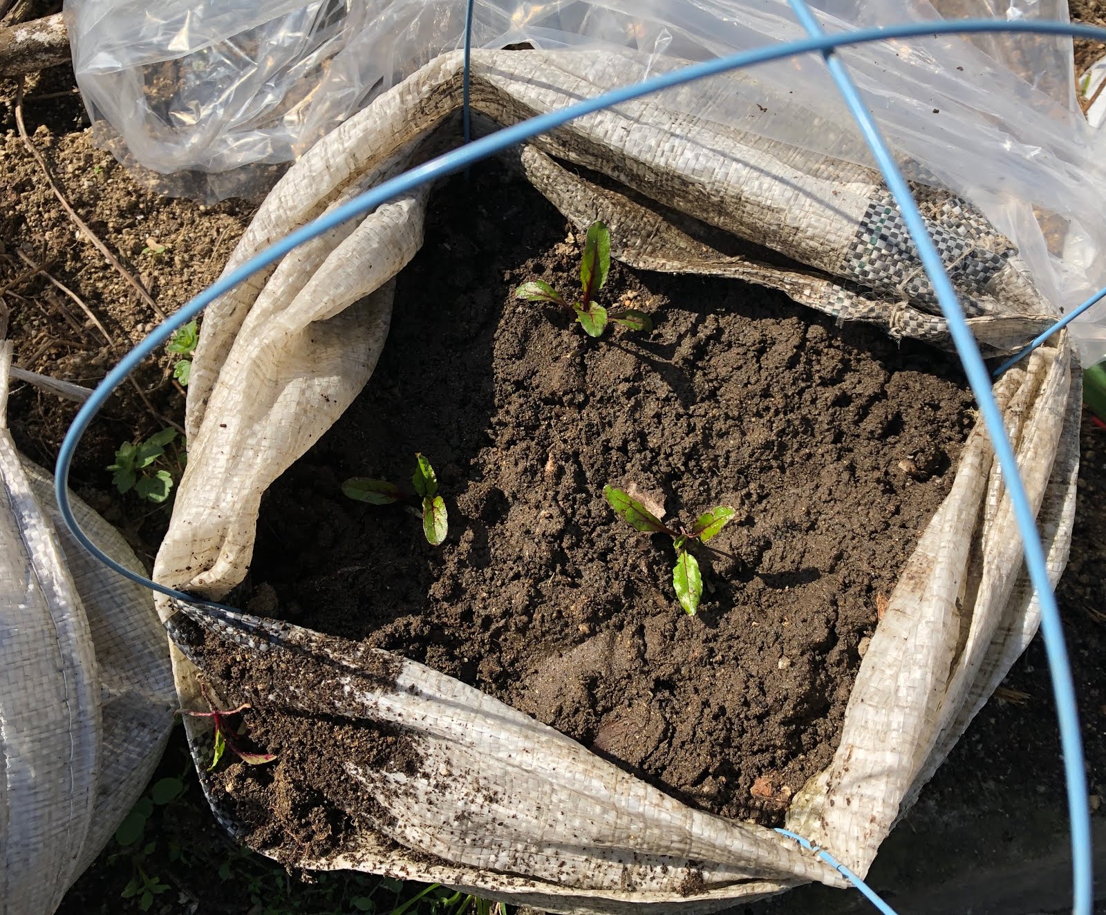 さて、第1菜園の土嚢袋のいくつかには、いつ種を蒔いたのかは忘れたのだが小さなBeetrootの芽が出ている。