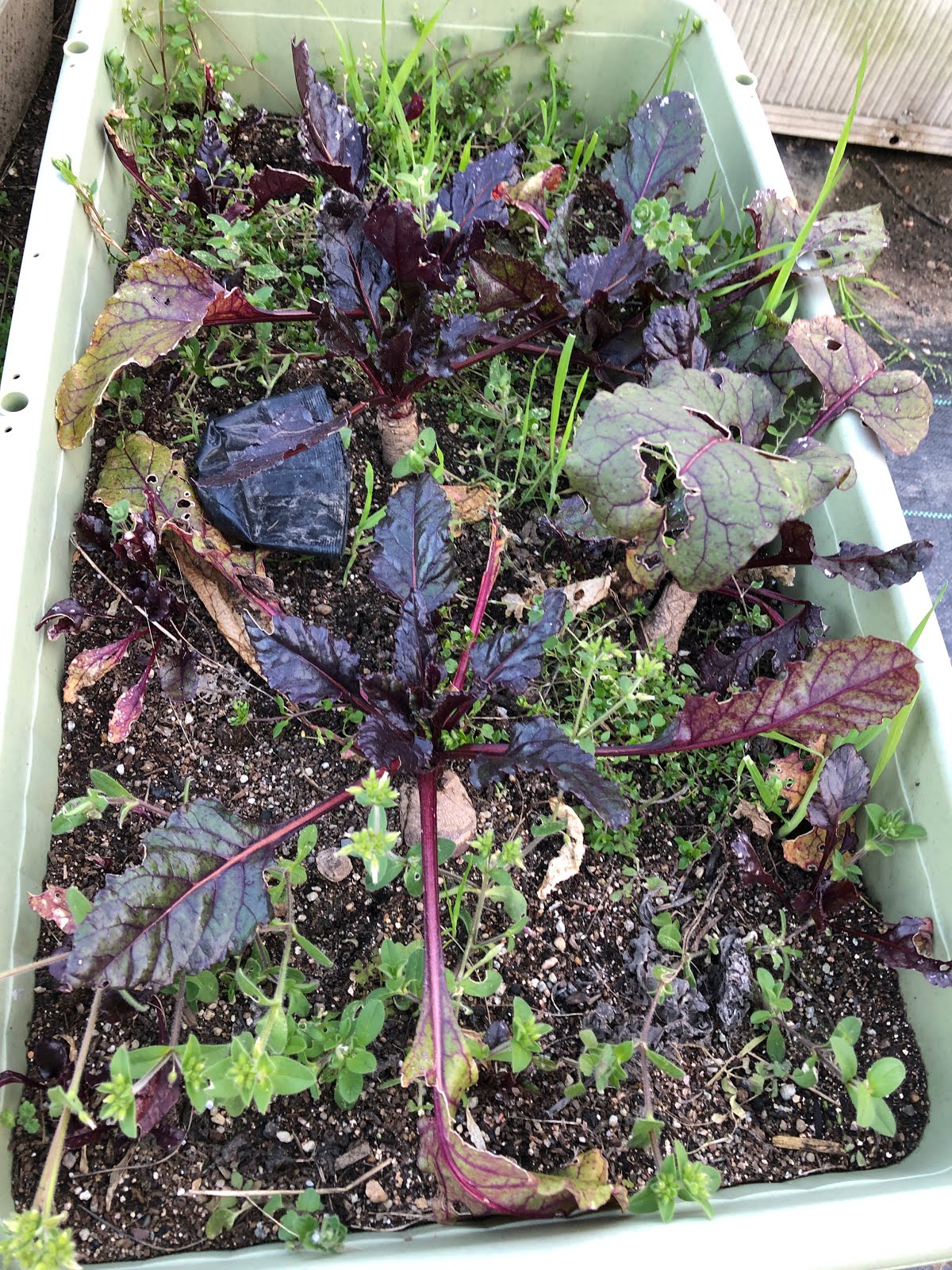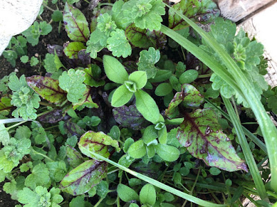 ホトケノザなどの雑草が、野菜が見えない程に茂っている。 |