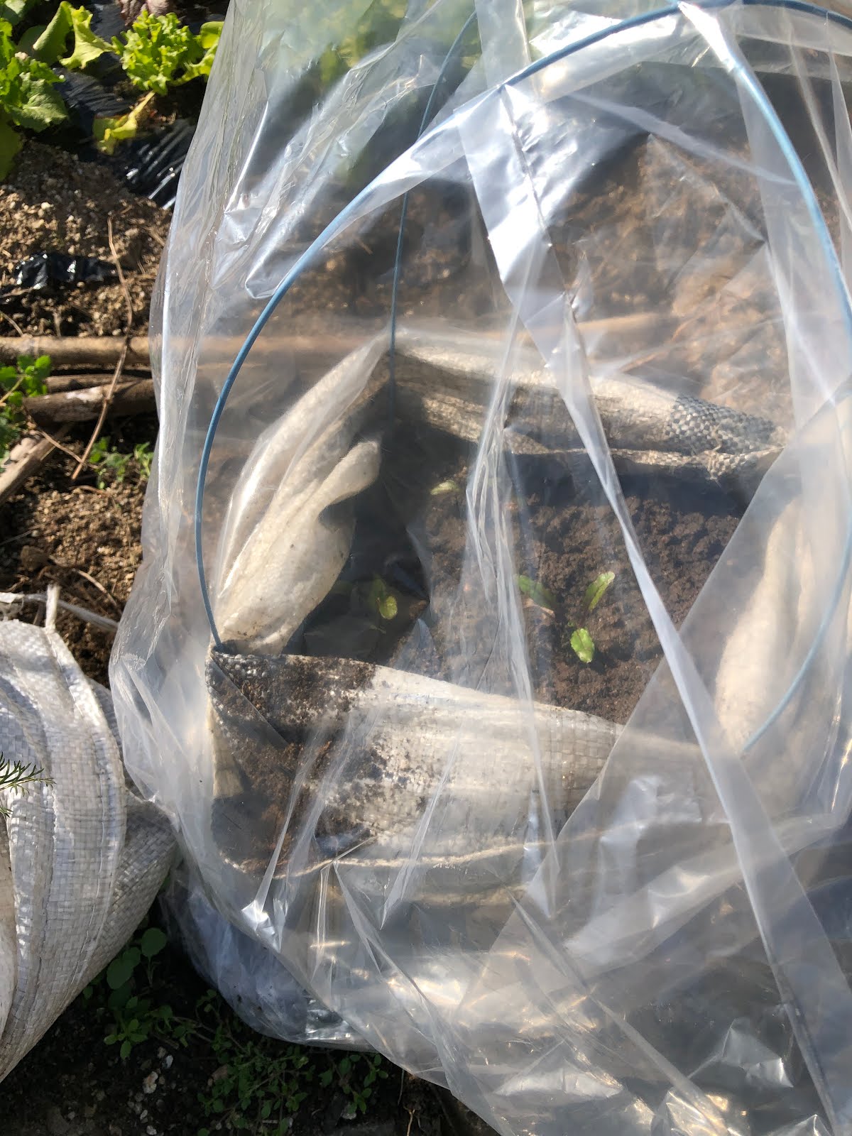 そこで、小さな土嚢袋に出てきた芽はビニール袋を被せて簡易温室状態にしてみることにした。