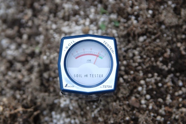 土に突き刺すタイプのPH測定器で土壌のPHを計って見ているのだが、場所によってかなり違った値が出るのにはちょっと驚きだった。