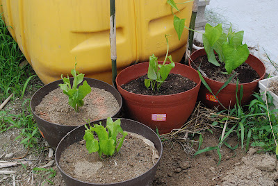 この時点ではミミズ堆肥の土のツクネ芋が成長一番で他は横一線だった。