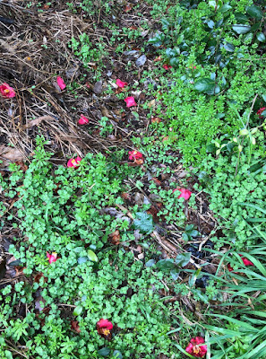 | 椿の木の下にはポタンポタンと落ちている花。 落ちた種から発芽したと思われる小さな苗もたくさんある。 椿の実でいつの日か椿油も作ってみたいなんて思っている。 |