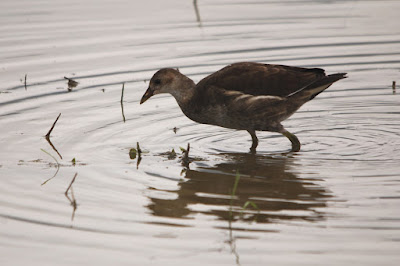 | こちらはバンの親鳥。 田んぼの真ん中までやってきて、しきりに水に中の餌を食べているようだ。 |